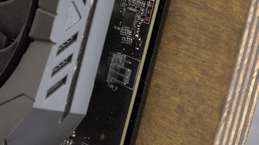 Еще одна особенность — это разъём ASUS Fan Connect 2. Расположен он на задней части платы, и к нему можно подключить корпусной вентилятор, который будет синхронизироваться по скорости с основными вертушками. Не могу сказать, что опция полезна для младших чипов, но в целом можно заморочиться, выставить большой вентилятор напротив видеокарты и отдать его под управление GPU.