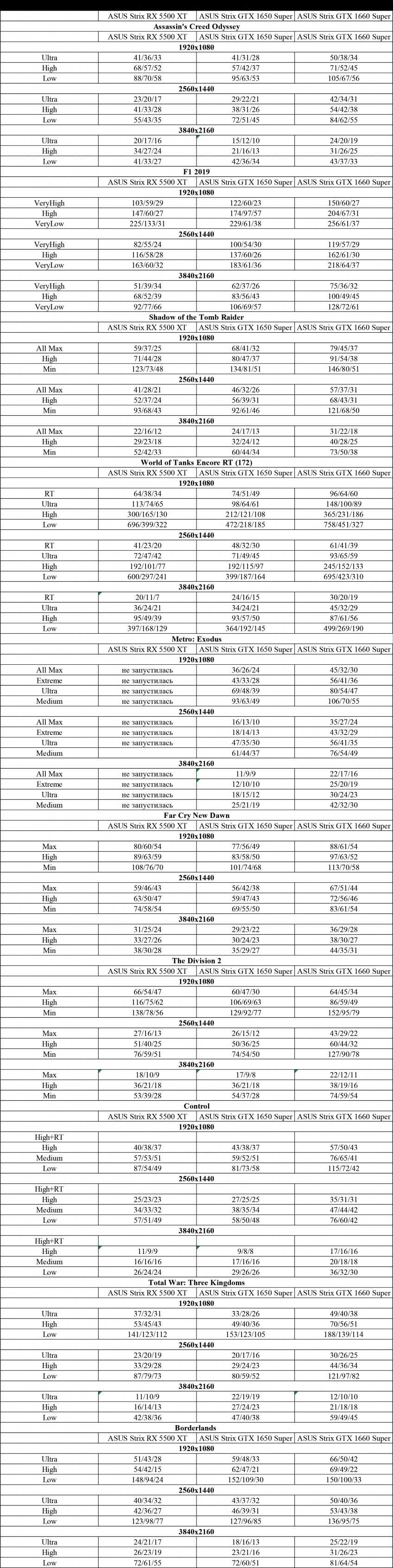 Специально для тех, кто промотал до конца, дадим краткий вывод. Выбирая между GTX 1650S и RX5500 XT, берите первую. Производительность у карт одинаковая, но GeForce дешевле. Дадут ли лишние гигабайты памяти на Radeon какое-то преимущество в будущем — пока не известно, производительность обеих карт явно упирается в графический процессор, а не объём GDDR6. GTX 1660S существенно быстрее обеих младших карт, но за стабильные 45-60 fps придется заплатить на 44% больше.