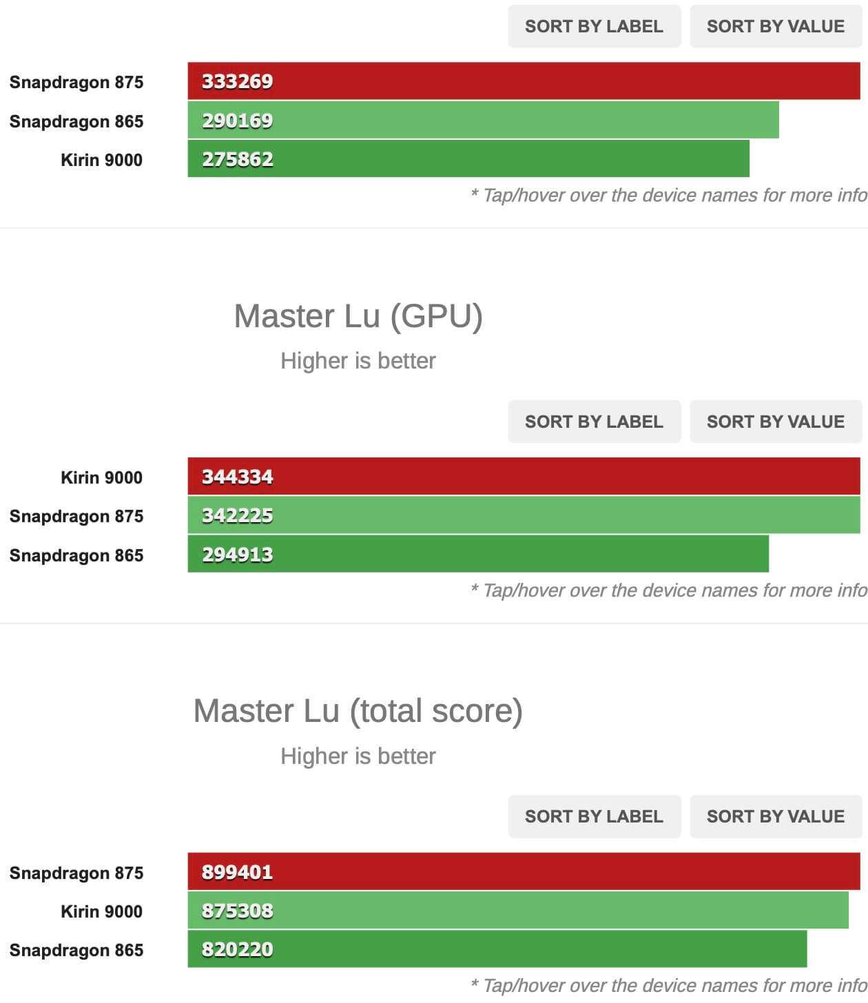 Цифры более красноречиво продемонстрируют то, о чем идет речь выше. Snapdragon 875 и 865 набрали 333 269 и 290 169 баллов соответственно в тестах Master Lu, а Kirin 9000 набрал 275 862 балла, что ниже результатов обоих чипов Snapdragon. Хотя по производительности графического процессора Kirin 9000 (344 334) смог получить незначительное преимущество над Snapdragon 875 (342 225) и заметное преимущество над более старым чипом 865 (294 913).