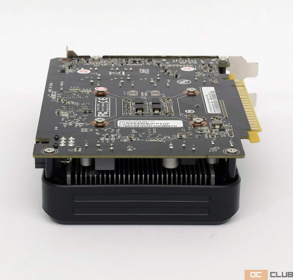 Взгляд на тыльную сторону адаптера раскрывает важный момент: а кожух-то можно снять без потери гарантии! Он просто прикручен на четыре винта без скрытых под радиатором. Через время почистить видеокарту от насосавшейся пыли будет очень легко. Жаль, что подобная реализация встречается так редко.