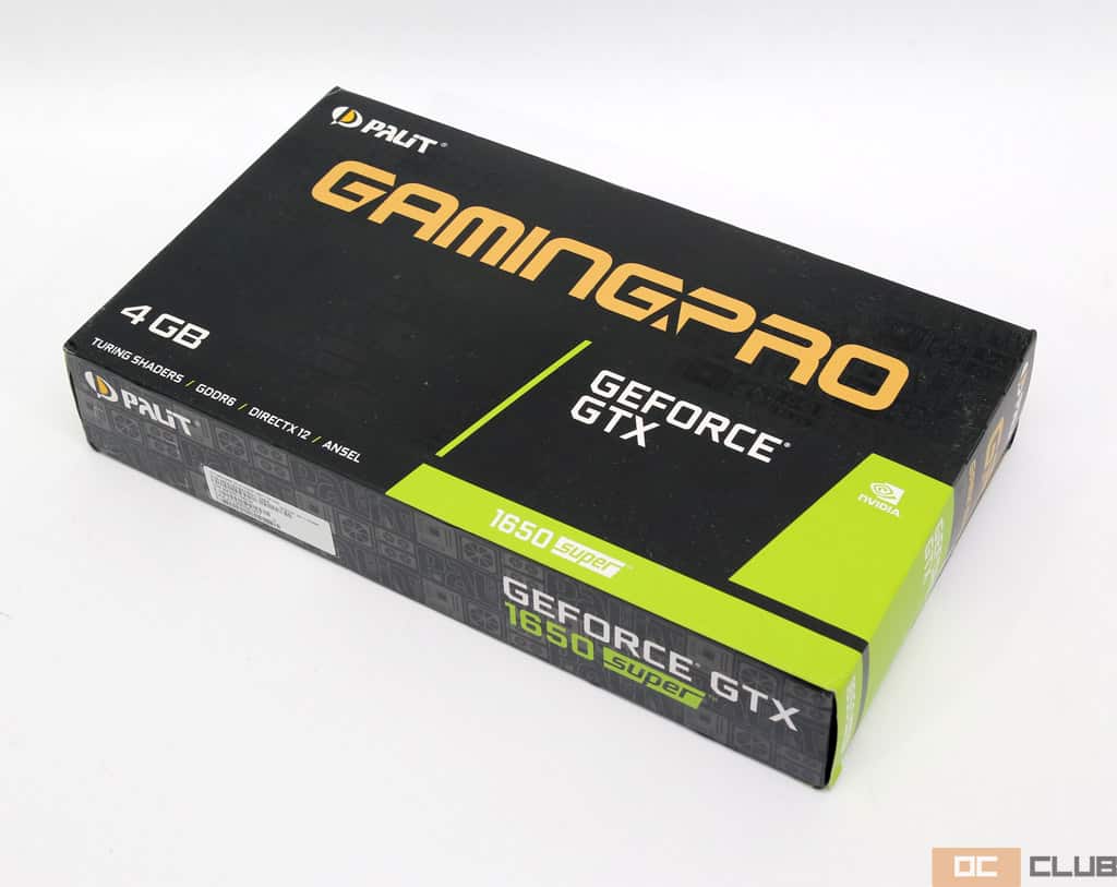 Palit GeForce GTX 1650 Super GamingPro поставляется в стандартной Palit-овской коробке, характерной для всех «не понтовых» видеокарт этого производителя последних лет. Классическое сочетание чёрного и зеленого, перечисление особенностей архитектуры NVIDIA Turing – всё стандартно.
