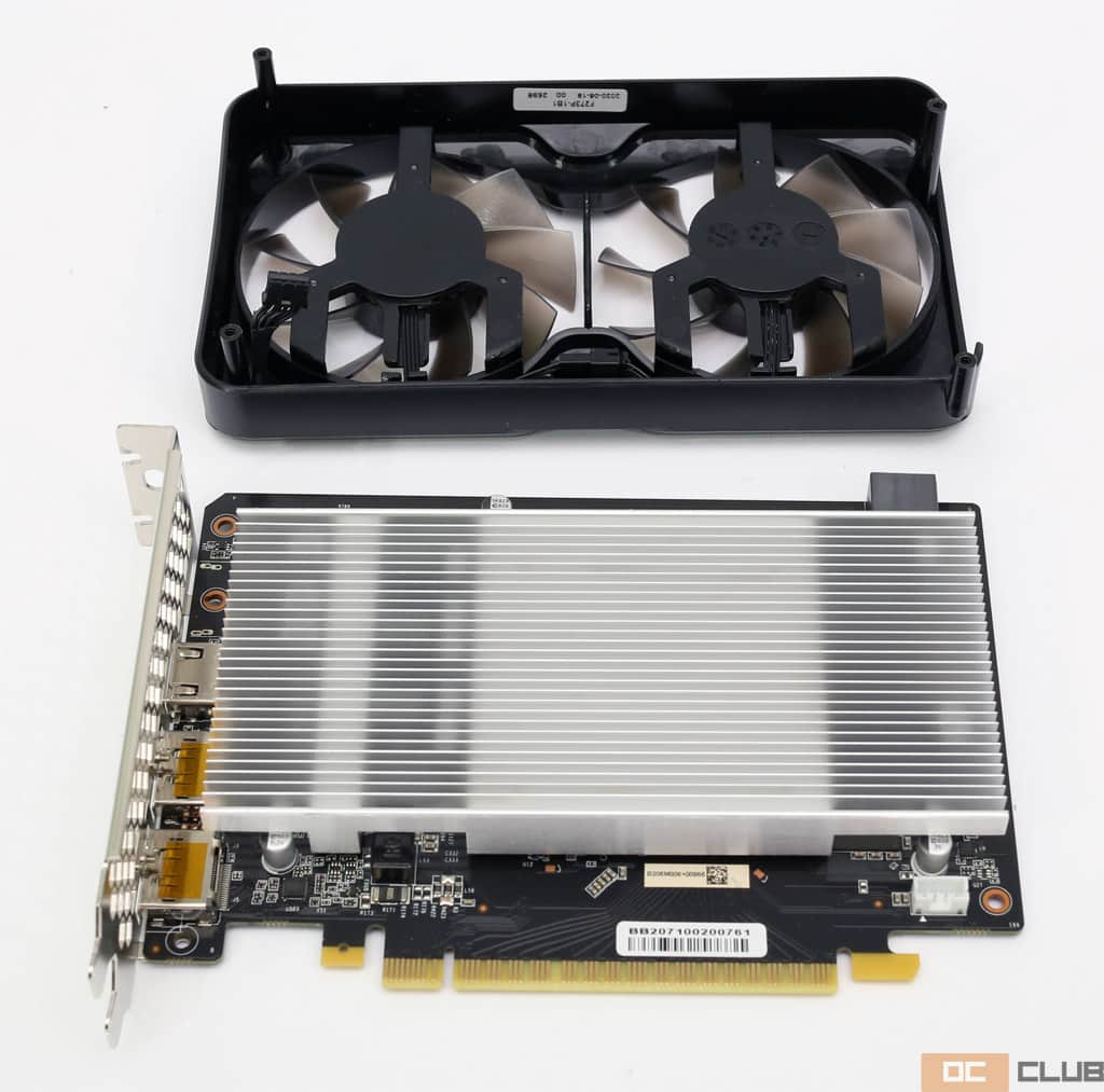 Радиатор вообще без меди изначально не внушает доверия, и даже на фоне 100-ваттного уровня TDP GTX 1650 Super. Но на фоне прочих «безмедных» радиаторов этот довольно массивный, и в довесок продувается сразу парой вентиляторов