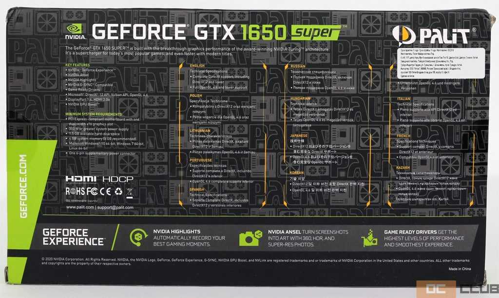С оборотной стороны снова приведены «фишки» NVIDIA, а не, увы, конкретно этого исполнения, а также перечислены минимальные системные требования. Ключевое – блок питания мощностью свыше 350 Вт, имеющий один 6-pin разъём дополнительного питания. 100-ваттный уровень TDP GeForce GTX 1650 Super не позволяет обойтись 75 ваттами, обеспечиваемыми слотом PCI-Express.