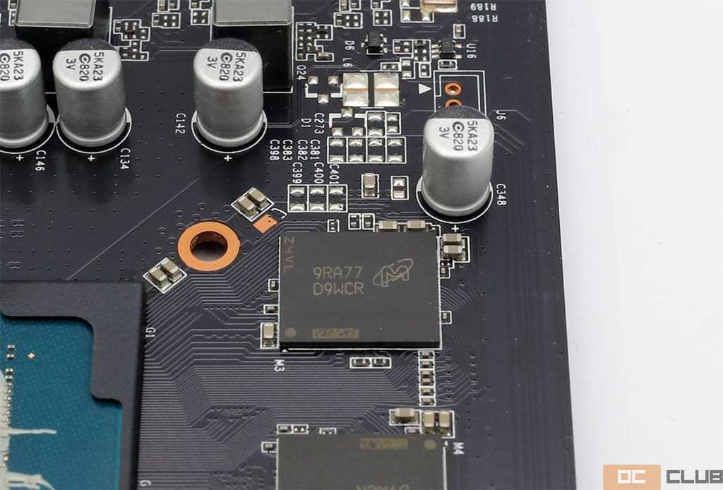 Память набрана микросхемами Micron D9WCR. Конкретно эти чипы, в отличии от модификации D9WCW (14 ГГц), очень часто встречающейся в видеокартах Palit, имеют штатный режим работы 12 ГГц. Увы, лёгкого приличного разгона памяти, кажется, не будет (к удивлению, будет!). Чипы память не охлаждаются.