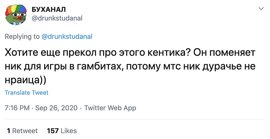 20 октября Gambit Esports анонсировала новый состав по Dota 2. Он полностью совпал с предсказанием drunkstudanal. Ян даже угадал, что Антону «DyrachYO» Шкредову, придется сменить никнейм после присоединения к новой организации — в анонсе его называют «yy». Еще один полностью сбывшийся инсайд в копилку «Бухой аналитики». Как следствие, результат был пересчитан.