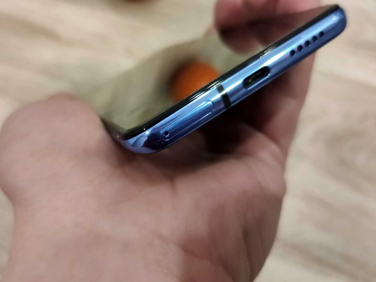 По дизайну проще всего смотрится смартфон OnePlus Nord. Это стандартный среднебюджетник 2020 года. Спереди и сзади у него стекло Gorilla Glass 5, но рамка пластиковая. Целостность экрана нарушена крупным овальным вырезом под двойную фронталку, зато поля очень узкие со всех сторон. На левой грани корпуса находится переключатель громкости, справа — кнопка питания и фирменный механический слайдер звуковых режимов. Два микрофона сверху и снизу. Также на нижней грани вы найдете порт USB-C, динамик и лоток для двух SIM-карт, как в POCO F2 Pro.
