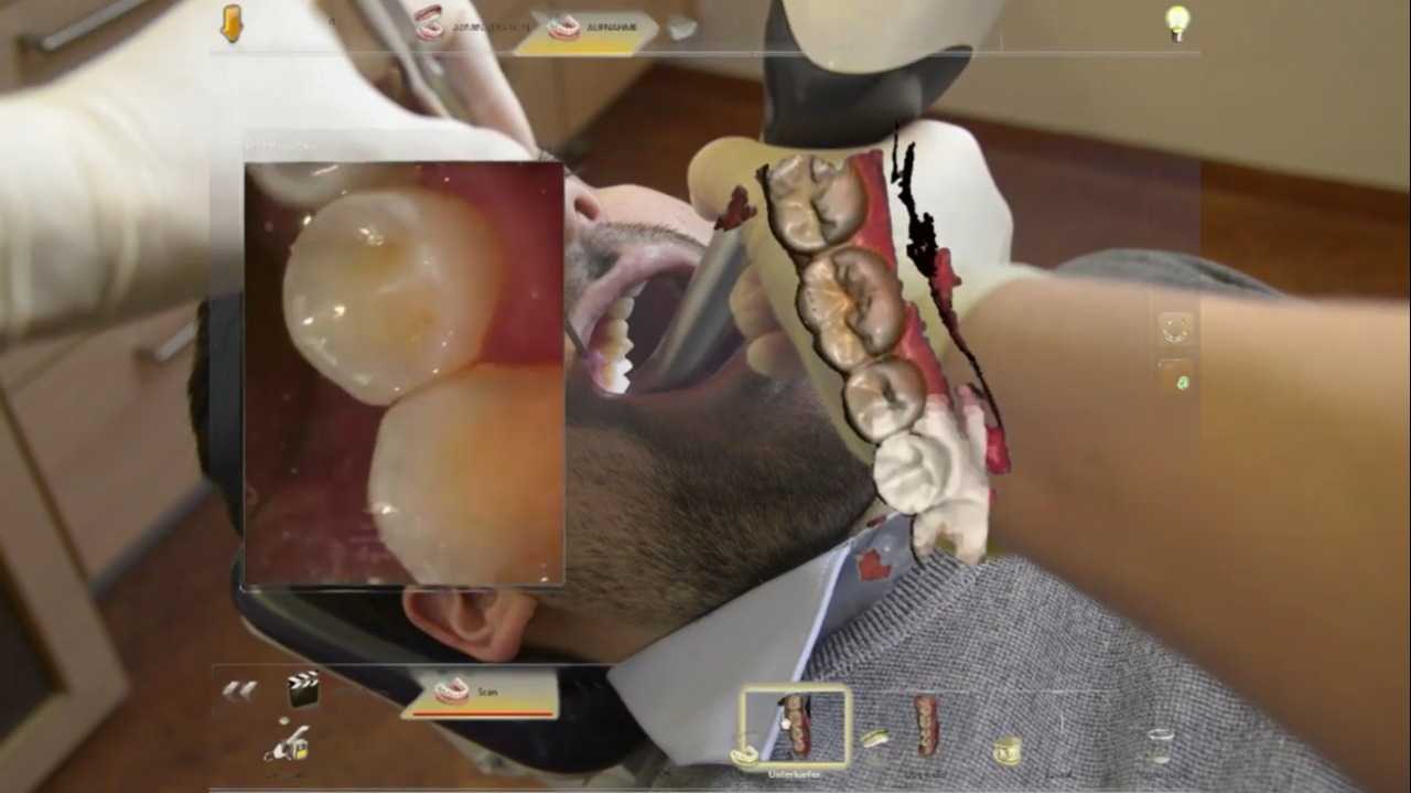 Для самого врача есть другое приложение для протезирования. С помощью специального стика с HD-видеокамерой сканируется нужный участок челюсти. Строится трехмерная модель, и уже на ее основе протезист создает проект коронки или моста. Обычно эти картинки подаются на монитор, расположенный где-то рядом, врачу приходится все время вертеть головой. А ПО EyeCad выводит всю информацию с камеры сканера на дисплеи очков врача, что позволяет ему сразу видеть и полость рта пациента, и рабочую область. Вся информация остается в памяти очков и доступна после общения с пациентом.