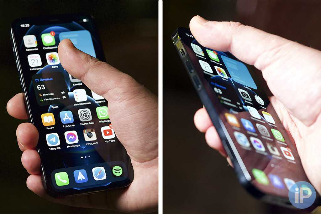У меня не самые большие руки, и до верхнего левого угла экрана, держа смартфон в правой руке, приходится тянуться. Но опять же, благодаря «рубленным» граням, можно просто слегка повернуть iPhone 12 Pro в ладони и добраться до самых дальних уголков.