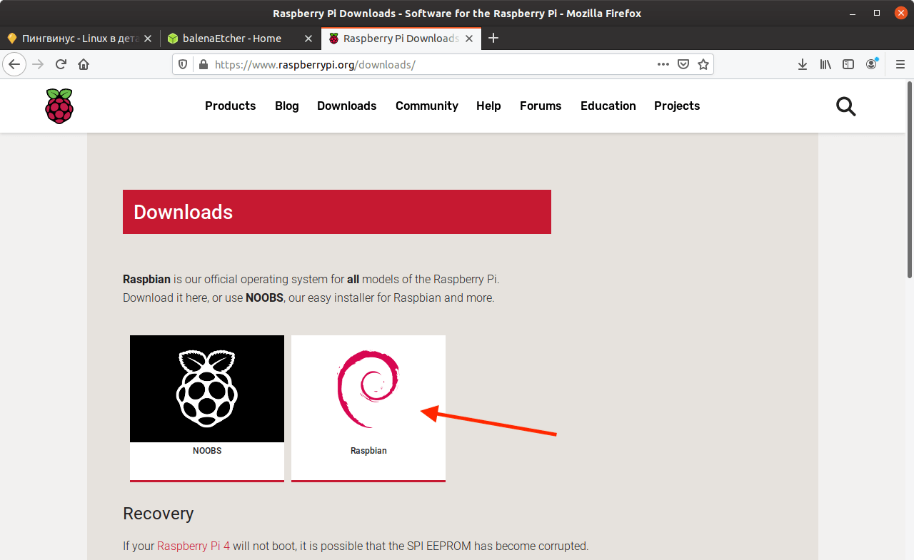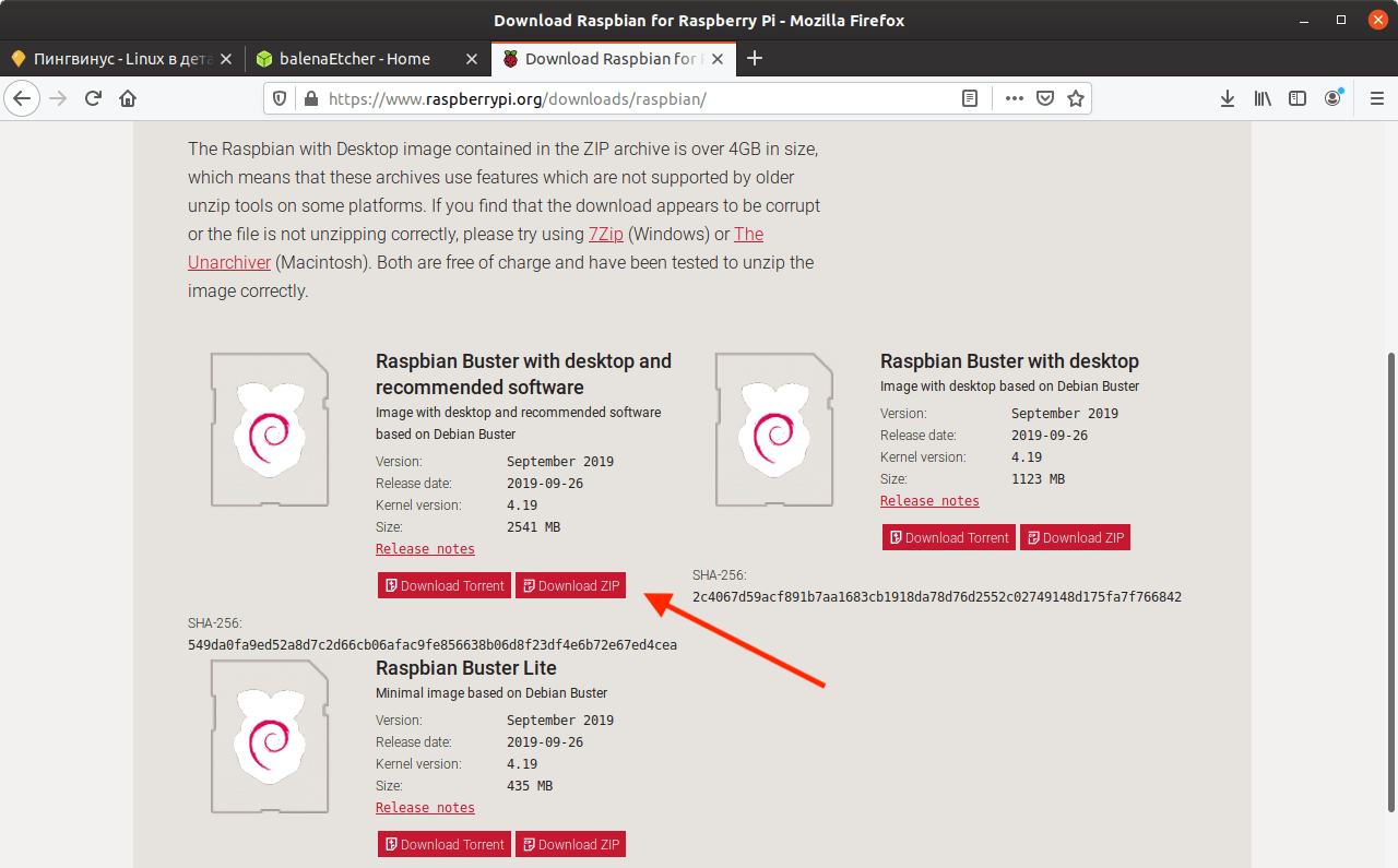 - Скачивание образа Raspbian (файл представлен в виде zip-архива).