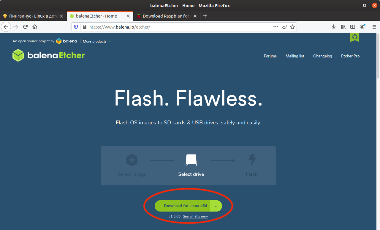 Теперь необходимо записать загруженный образ Raspbian на microSD карту. Для этого можно воспользоваться очень простой и бесплатной программой Etcher. Она доступна для Linux, Windows и MacOS.
