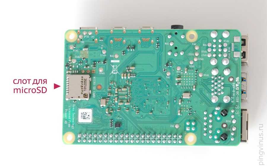 После того, как вы записали образ системы на карту, необходимо вставить карту в слот, который расположен на обратной стороне платы Raspberry Pi.