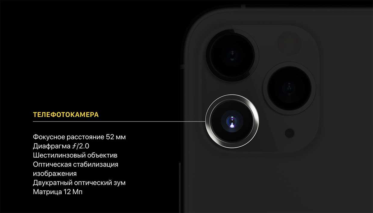 Телевик в iPhone 11 Pro состоит из шести линз и снимает фото в разрешении 12 мегапикселей. Размер пикселя 1,0 мкм (микрометр). Фокусное расстояние 52 мм, диафрагма ƒ/2.0.