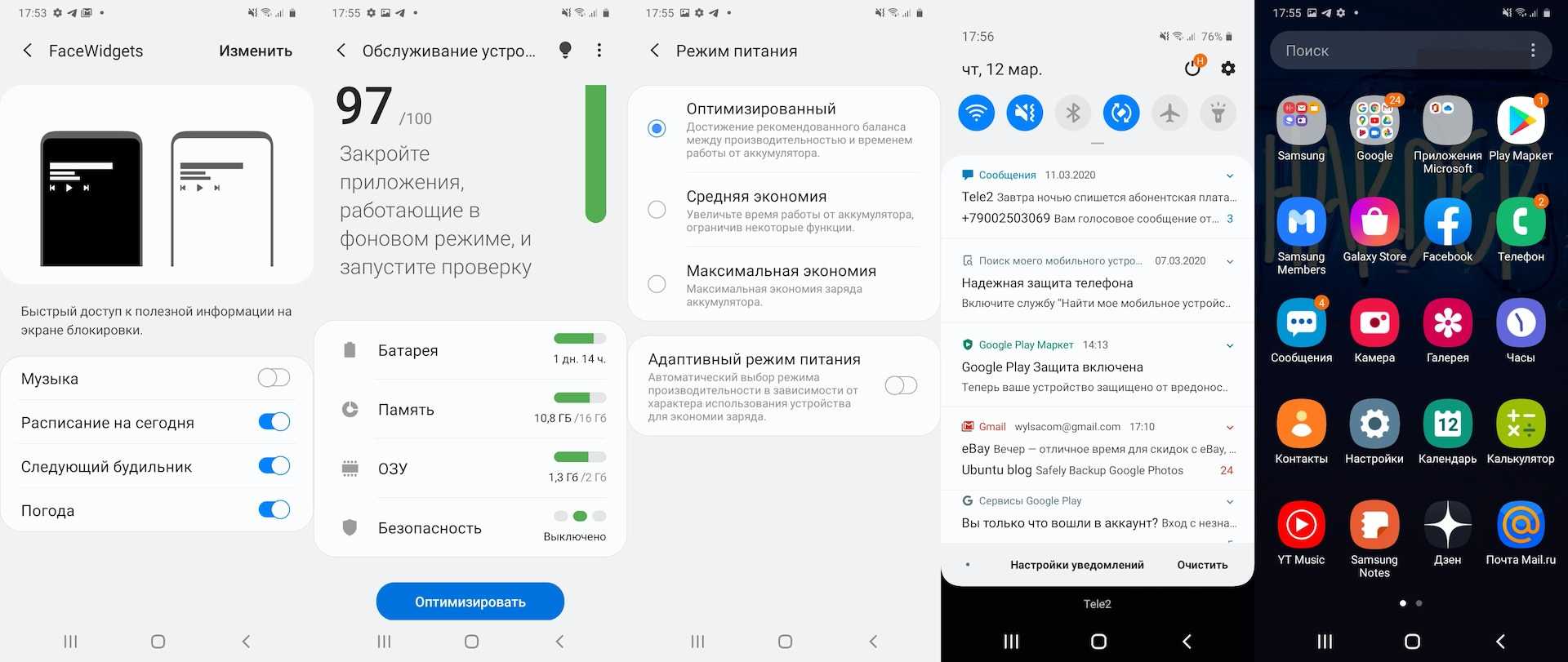 В настройках системы можно поменять управление с виртуальных кнопок на жесты, выбрать темы оформления, менять светлый интерфейс на тёмный, настроить виджеты и ярлыки на экране блокировки. Встроенный диспетчер задач показывает, чем занята память, можно просканировать систему на вирусы при помощи McAfee, а также увидеть приблизительное время работы телефона при текущей загрузке.