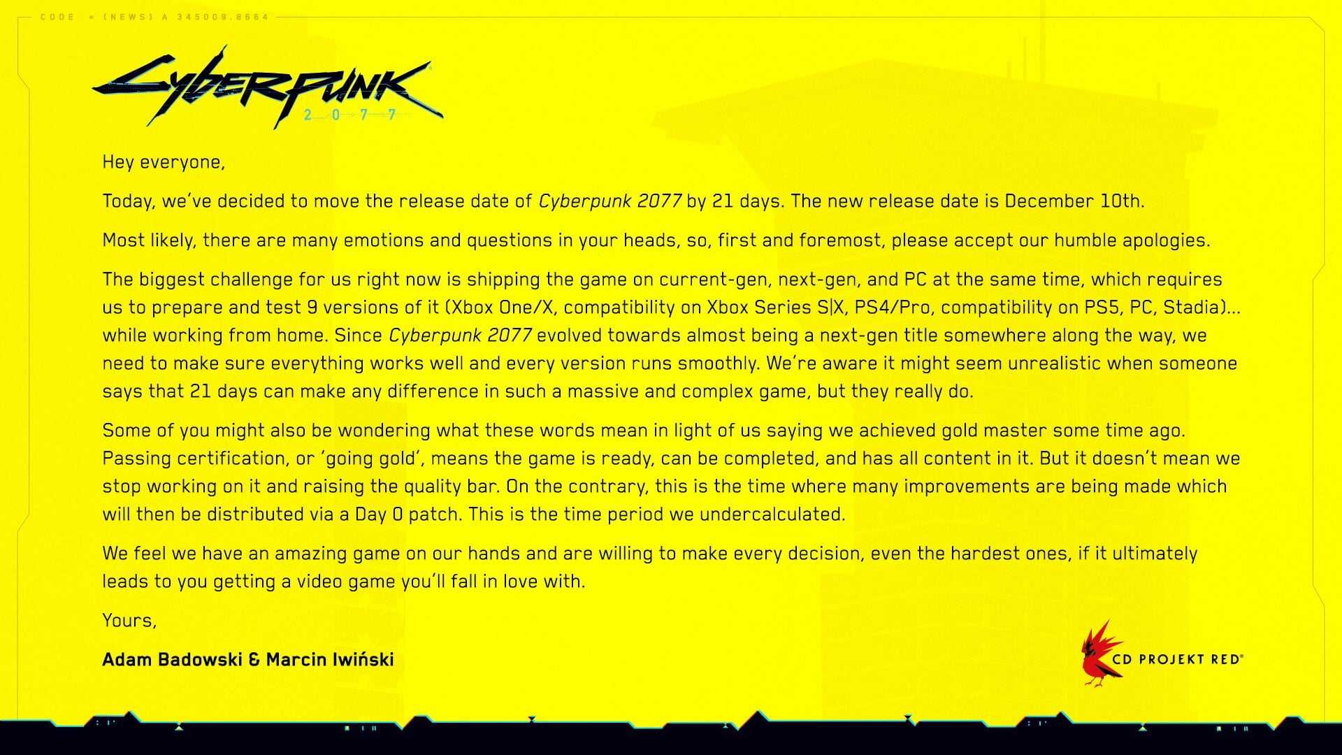 Все переносы оправдывались тем, что разработчики хотят сделать игру лучше. Когда Cyberpunk перенесли с сентября на ноябрь, CDPR говорили: «Те, кто знают нас, подтвердят:, мы не будем продавать то, что еще не готово. Это не просто слова — это девиз нашей компании».
