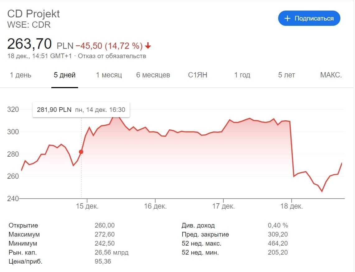 Скорее всего, акции изначально были переоценены – цены игнорировали и три переноса (были легкие падения, но акции тут же возвращались на прежний уровень), и ожидаемые баги после релиза, которые исправить должен был огромный патч первого дня. Для CD Projekt RED это ужасно еще и потому, что компания годами работала над «Киберпанком», как над «Ведьмаком 3» до этого. За это же время EA успела выпустить 5 новых частей FIFA, которые даже при разгромной критике собирают компании кассу и гарантируют спокойное производство следующего проекта.