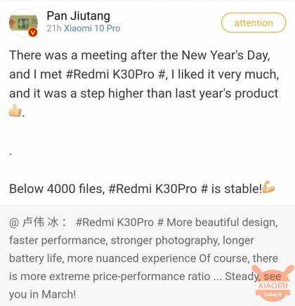 В недавнем посте на Weibo, известной социальной сети, где бренд-офицеры используются для предварительного просмотра официальных новостей, таких как Пан Цзютан, аналитик и исторический сотрудник Xiaomi, ответил бы уважаемым Лу Вейбинг, В этом рекламном посте рассказывается о процессоре Qualcomm Snapdragon 865, который будет установлен на Redmi K30 Proаналитик сказал бы, что стоить устройства будет менее 4000 юаней.