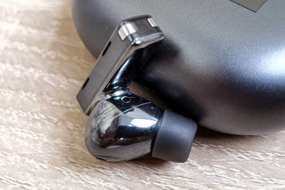 Теперь про наушники. На внешней прямоугольной ножке каждого вкладыша имеются по два микрофона с антиветровым дизайном – отверстий для них просто нет. Я не знаю, как это возможно, даже и не спрашивайте. Видно только две точки чуть темнее, чем общий материал корпуса и по 2 микроскопические прорези с каждой стороны. На передней плоской части ножки – сенсорная зона для управления функциями наушников.