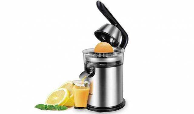 SONIFER SF5523 отличается от всех моделей в обзоре исполнением, так как рассчитана только на приготовление сока из цитрусовых. Корпус соковыжималки выполнен из нержавеющей стали, фильтр и сливное отверстие – из пищевого алюминия, пресс-формы – из безопасного пластика. В комплект входит две формы для фруктов разных размеров. Приготовление сока происходит путём нажатия на ручку, которая осуществляет давление на фрукт. Мотор мощностью 300 Вт обеспечивает полное выдавливание сока, чего невозможно добиться с помощью ручного способа выжимания.