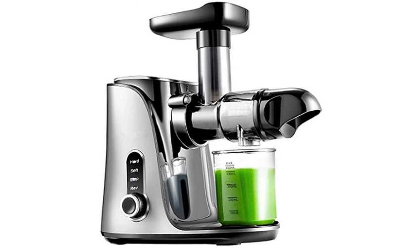 Следующую позицию ТОПа занимает Aobosi GM3001- шнековая модель. Она отличается конструктивно – имеет вид мясорубки. Шнек и система фильтров располагаются горизонтально, обеспечивая медленное массажирование для извлечения максимального количества сока и питательных веществ. Работает в двух режимах: деликатный (50–60 оборот в минуту) для мягких и сочных продуктов, сильный (100–110 оборотов) для твёрдых овощей и фруктов. Также есть кнопка реверса, которая позволяет извлечь застрявшие частицы или очистить фильтр. В отличие от вышеописанных моделей, она оснащена светодиодным дисплеем, на котором указывается выбранный режим работы. Комплектуется ёмкостью для жмыха, стаканом для сбора жидкости, на котором есть мерная шкала. К нему идёт силиконовая крышка, что позволяет безопасно хранить сок в холодильнике до 72 часов. Также покупателю предоставляется две пластиковые бутылки по 0,5 л с крышками. Все съёмные детали изготовлены из высококачественного пищевого пластика. Их можно мыть в посудомоечной машине.
