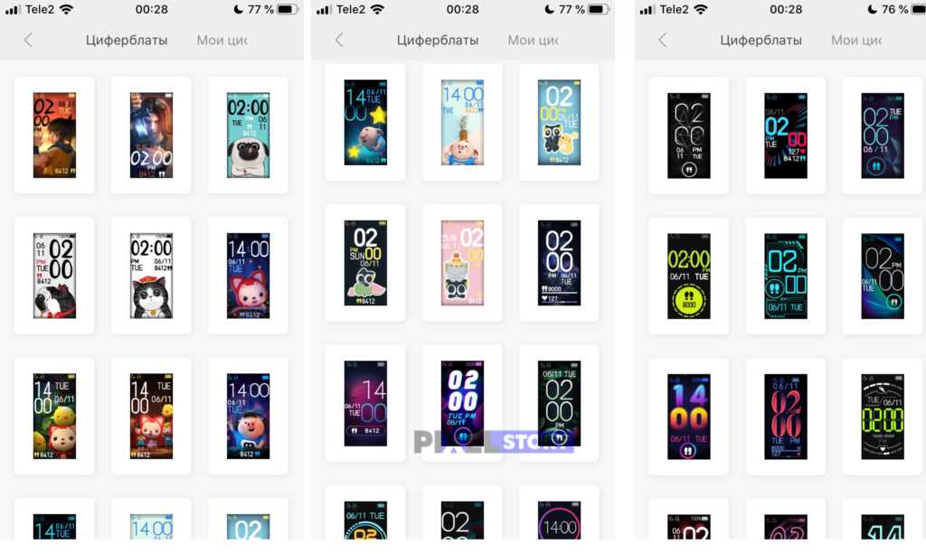 Еще три варианта можно добавить в память устройства из приложения. Всего же в магазине циферблатов доступно более 100 вариантов различных циферблатов, как статических, так и динамических с мультяшными героями. Есть возможность настроить под себя циферблат, заменив фон, шрифт и т.д. Как изменить и настроить главный экран, читайте в конце инструкции.