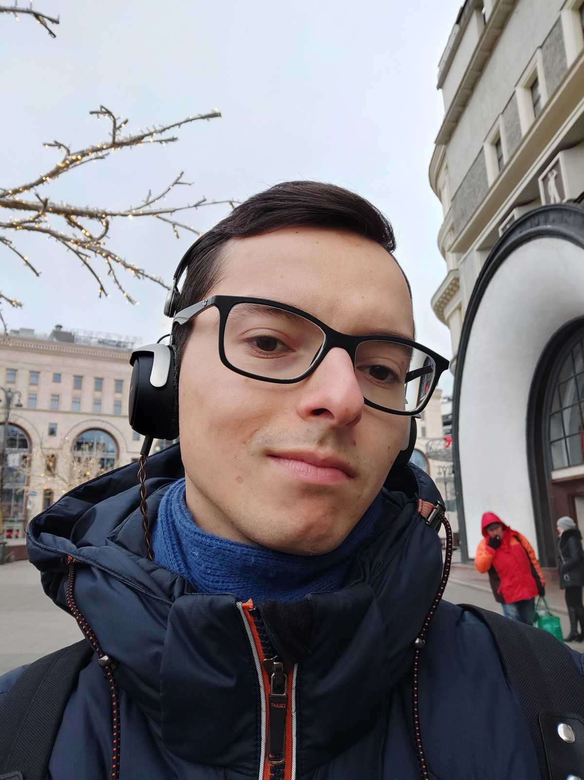 Фронтальная камера имеет разрешение 32 Мпикс, объектив светосилой f/2,0. При этом у неё нет автофокуса и вспышки, зато есть вполне рабочий портретный режим с тем же набором фильтров и бьютификатором, что и у тыльной камеры. Качество снимков весьма неплохое, стоит отметить удачно выставленный фокус и корректную работу оптики — лицо искажается минимально.