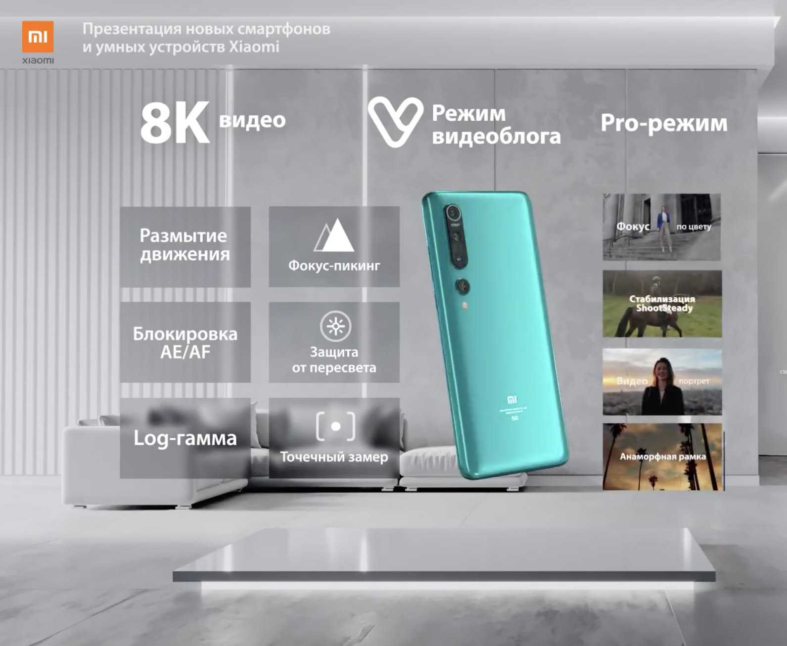 Xiaomi Mi 10 снимает видеоролики в разрешении 8К. Фронтальная камера встроена в экран, никаких «чёлок» и вырезов нет.